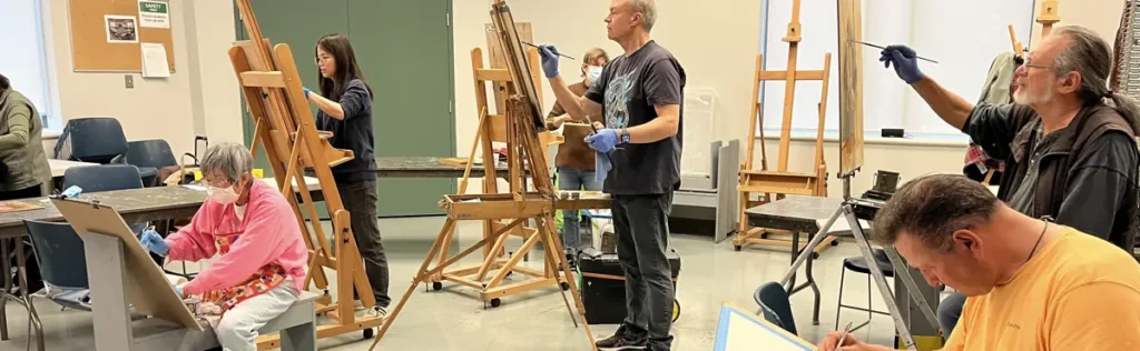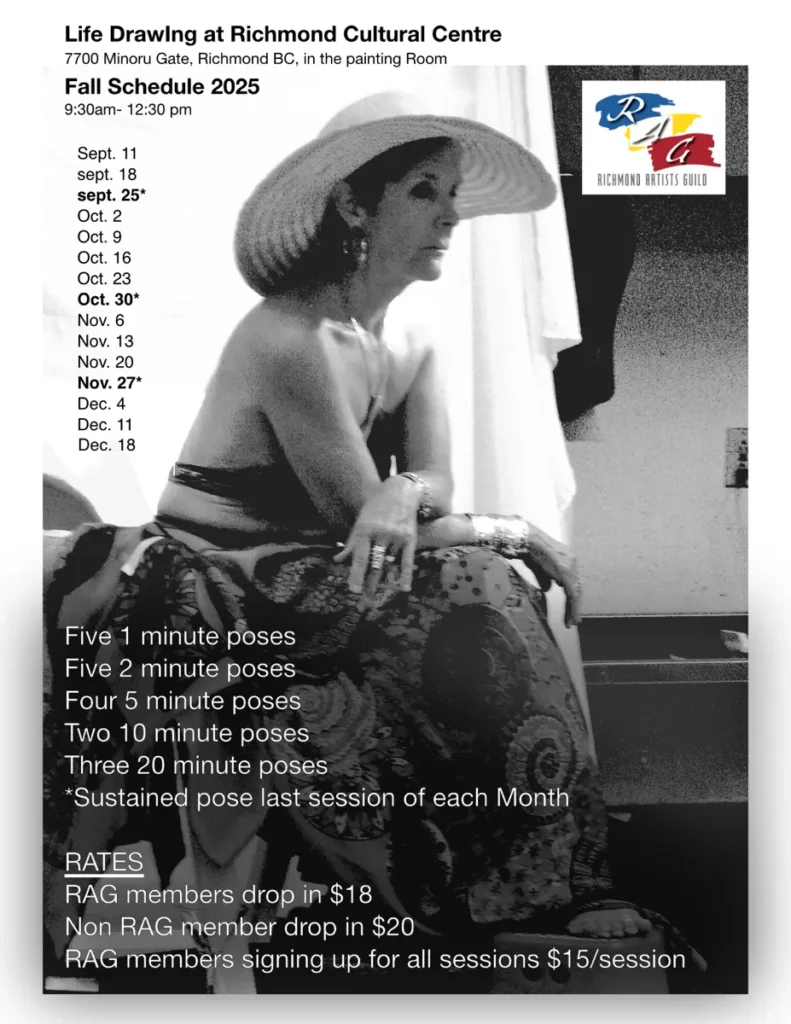 Life Drawing takes place in the Painting Room in the Richmond Cultural Centre. There are some easels, donkey benches, support boards, tables and chairs. But other supplies of art materials will be the responsibility of each artist. Any member who can come early to set up the room would be appreciated. Also, all attendees are responsible for clearing the room as specified by the Centre. It is a friendly gathering, and everyone; young/mature, inexperienced/professional, is most welcome to join us.
